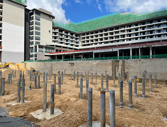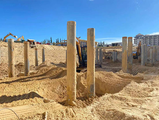 海南清水湾某街电改造工程新增露天型地下室,工程特点:超厚砂层边坡支护,超厚砂层新加静压预应力管桩施工,超大体积新旧地下室主体结构连接处理。